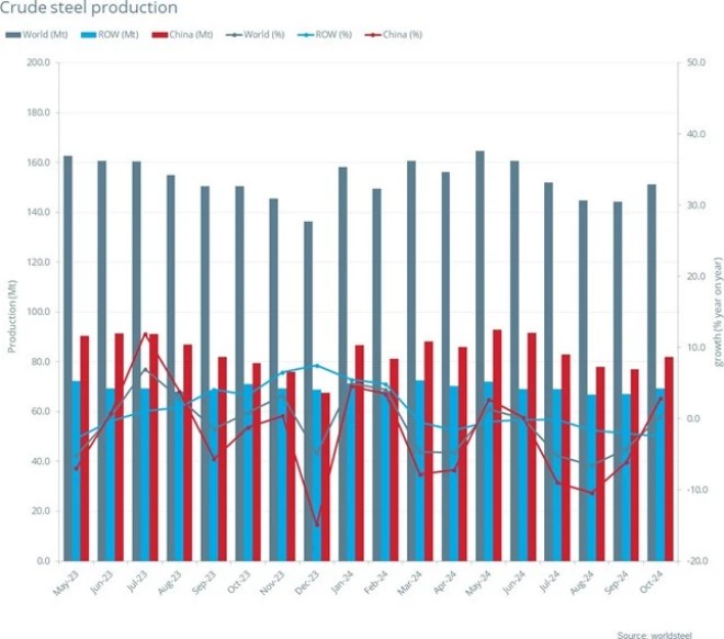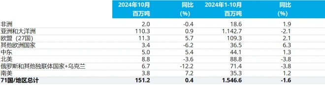 2024年10月全球71個納入世界鋼鐵協會統計國家/地區的粗鋼產量為1.512億噸,同比提高0.4%。