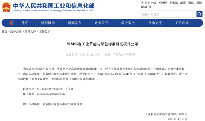 11月21日,工業和信息化部發布《2024年度工業節能與綠色標準研究項目公示》(以下簡稱《公示》)。