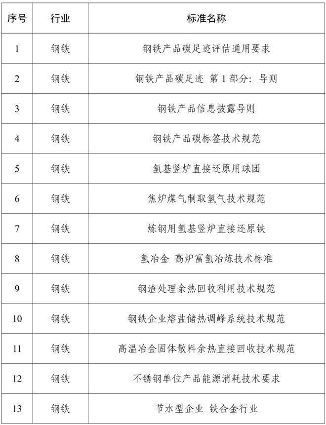 《公示》中顯示共有涉及多個行業、60項工業節能與綠色標準研究項目。其中,有關鋼鐵行業14項標準名稱如下——