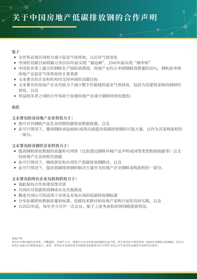 發布《合作聲明》的目的,是讓中國主要的房地產和鋼鐵企業自願承諾推廣低碳排放鋼的使用。