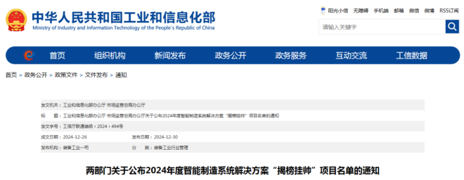 12月30日,工業和信息化部與市場監管總局辦公廳公布了2024年度智能製造係統解決方案“揭榜掛帥”項目名單。