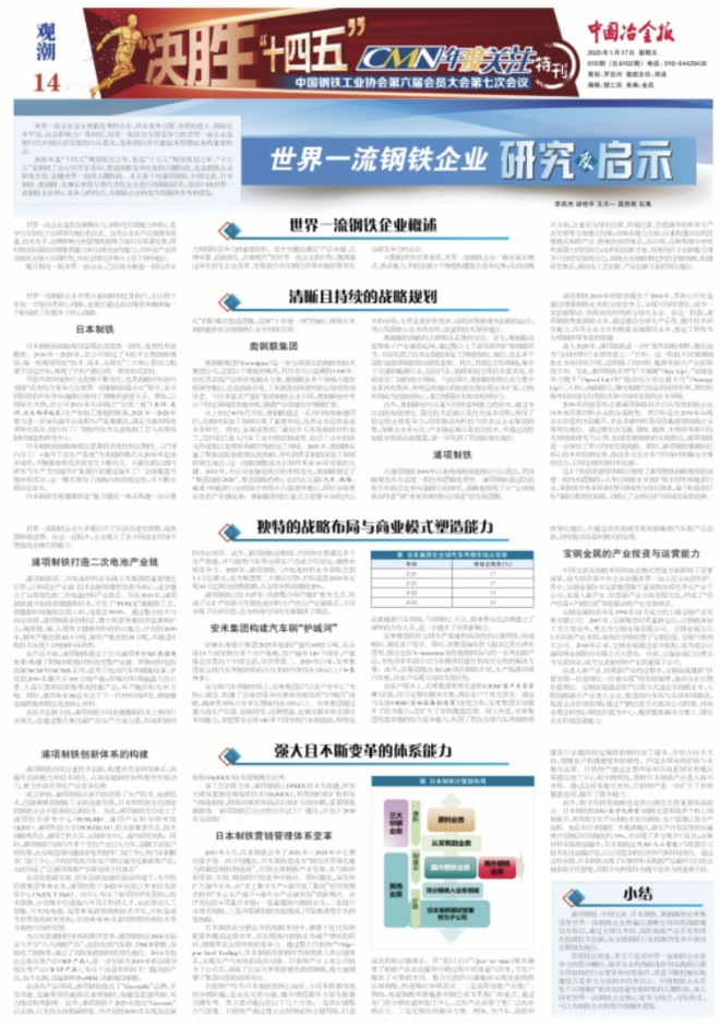 2025年是“十四五”規劃收官之年,也是“十五五”規劃謀劃之年。“十五五”是鋼鐵工業應對百年變局、塑造戰略競爭優勢的關鍵階段,也是鋼鐵企業轉型升級、創建世界一流的關鍵階段。本文基於對浦項製鐵、中國寶武、日本製鐵、奧鋼聯、安賽樂米塔爾等代表性企業進行的跟蹤研究,嚐試歸納世界一流鋼鐵企業核心競爭力的特點,為鋼鐵企業轉型升級提供參考和借鑒。