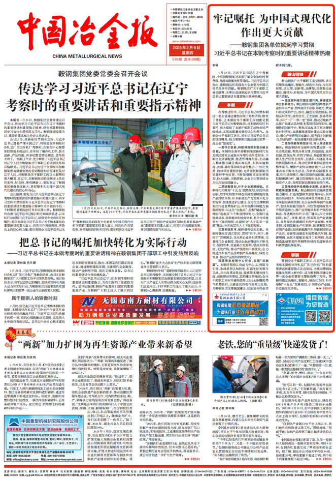 【1】 凡本網注明"來源:中國冶金報—中國鋼鐵新聞網"的所有作品,版權均屬於中國鋼鐵新聞網。媒體轉載、摘編本網所刊 作品時,需經書麵授權。轉載時需注明來源於《中國冶金報—中國鋼鐵新聞網》及作者姓名。違反上述聲明者,本網將追究其相關法律責任。