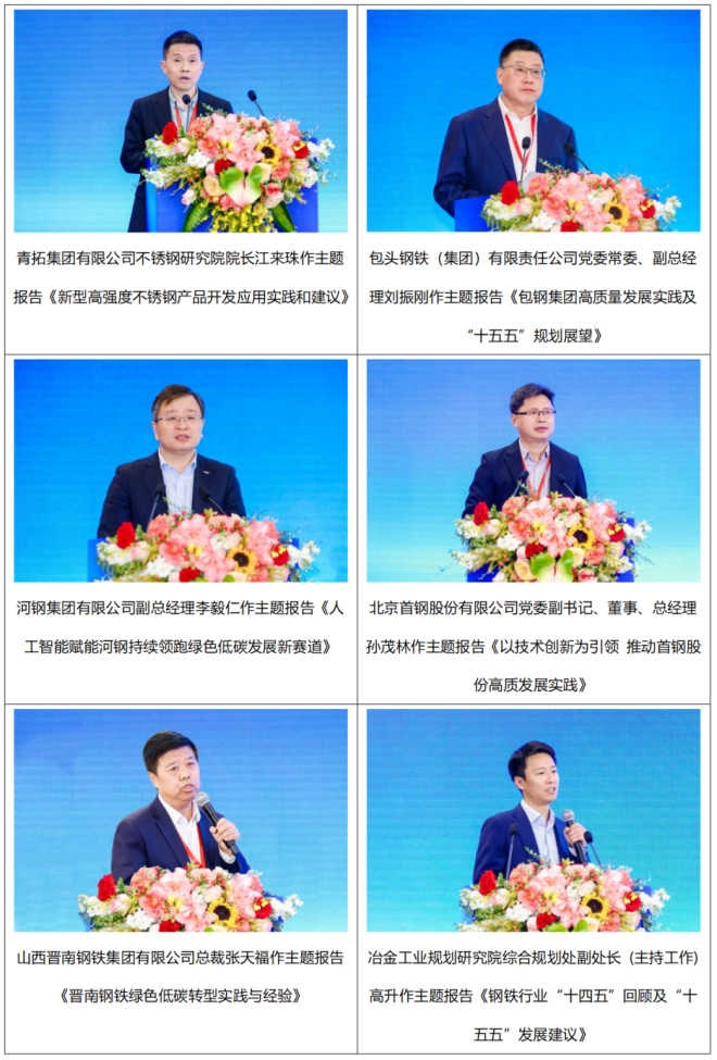 會上,青拓集團有限公司不鏽鋼研究院院長江來珠,包頭鋼鐵(集團)有限責任公司黨委常委、副總經理劉振剛,河鋼集團有限公司副總經理李毅仁,北京首鋼股份有限公司黨委副書記、董事、總經理孫茂林,山西晉南鋼鐵集團有限公司總裁張天福先後做企業經驗交流。冶金工業規劃研究院綜合規劃處副處長 (主持工作) 高升作主題報告。