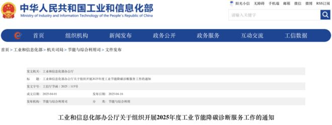 工業和信息化部辦公廳關於組織開展2025年度工業節能降碳診斷服務工作的通知