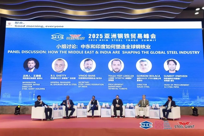 在“中東和印度如何塑造全球鋼鐵業”小組討論環節,阿聯酋AGIS塗鍍板廠總經理B.S.SHETTY,印度鋼鐵應用商協會秘書長VINOD BANE,土耳其TATMETAL塗鍍板廠采購部TOLGA YiGIT CEKICLER,迪拜GALEX STEEL有限公司董事長GORKEM BOLACA,阿聯酋阿巨瑪鋼管廠采購部部長SUMEET DWIVEDI,圍繞中東、印度的國內鋼鐵需求及國際貿易現狀,展望了未來發展的潛力空間。