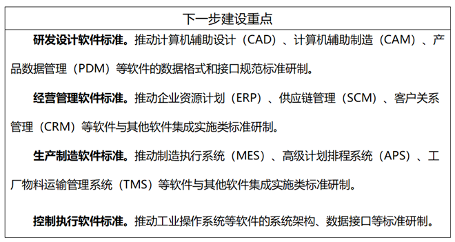主要包括製造執行係統(MES)、高級計劃排程係統(APS)、工廠物料運輸管理係統(TMS)、能源管理係統(EMS)、故障預測與健康管理軟件(PHM)、運維綜合保障管理(MRO)等生產製造軟件應用指南和集成實施標準。