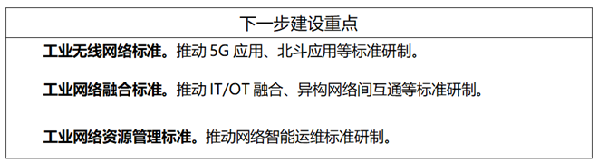 工業無線網絡標準主要包括無線局域網(WLAN)、無線可尋址遠程傳感器高速通道(WirelessHART)、用於工廠自動化/過程自動化的工業無線網絡(WIA-FA/PA)、窄帶物聯網(NB-IoT)、5G應用、北鬥應用等標準。工業有線網絡標準主要包括現場總線、工業以太網、工業無源光纖網絡(xPON)、工業綜合布線、單對線以太網等標準。工業網絡融合標準主要包括確定性網絡(DetNet)、時間敏感網絡(TSN)、信息技術/運營技術(IT/OT)融合、異構網絡間互通、IPv6+、高可靠組網等標準。工業網絡資源管理標準主要包括網絡地址管理、網絡頻譜管理、網絡智能運維等標準。