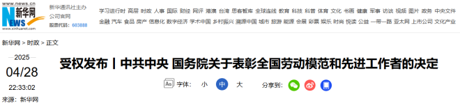 同日,新華網發布《中共中央國務院關於表彰全國勞動模範和先進工作者的決定》。