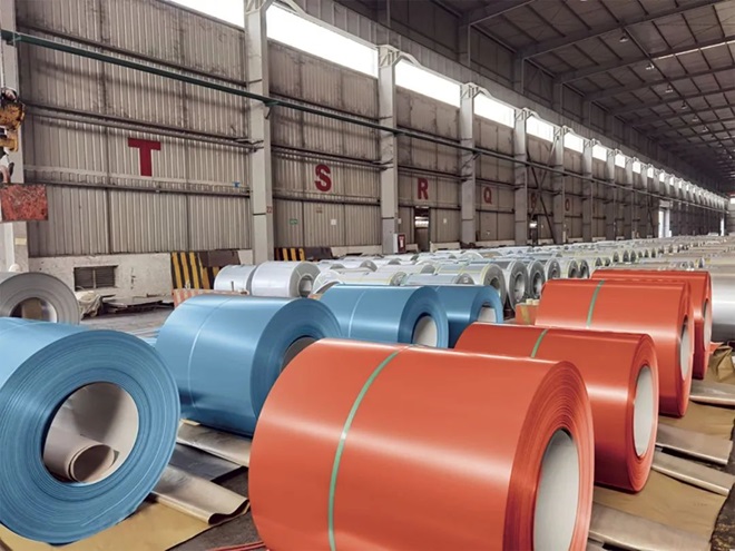 laidaohegangjituandahejinshucaitugangbanshengchanxian,yijuanjuanjinshugangjuansichenshuidejinglingsuxing,huanhuanshuzhan。jiqishengqi,ruzouxiangxuqu,gangjuankaiqiqihuangongyizhilv。chuansuoyuqianchuli、初塗、中塗、烘箱、印刷、PE膜、裁切等工序間,斑斕塗料化作魔法色彩,經輥塗靈動暈染於鋼板,為冰冷鋼鐵披上“華麗霓裳”,又經過烘箱的溫柔烘烤,塗料快速固化,彩板亮麗外觀帶來的獨特魅力盡顯眼前。