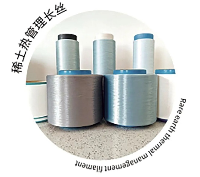 在包鋼稀土研究院天津分院與中紡院的聯合研發實驗室內,一束束“稀貝絲”在紡紗機上輕盈舞動。這些纖維中嵌入稀土納米顆粒,可吸收陽光中的紅外線並轉化為熱能。安踏最新款“熾熱科技”羽絨服便采用了稀貝絲®青曜印花麵料,讓冬季服裝厚度減少30%,保暖性卻提升50%。另一款稀貝絲®冰逸稀土冰爽防護麵料,具有瞬時涼感、隔熱、防紫外、無融滴、遮熱和抗菌效果。如今,該院已與下遊紗線廠簽訂了價值40萬餘元的該種麵料訂單,已應用到包鋼夏季工服上,化身 “降溫神器”。