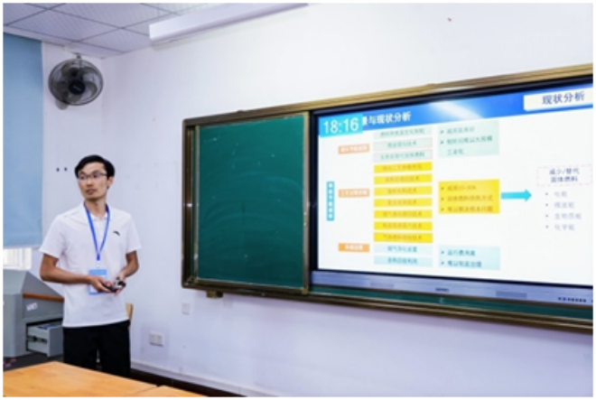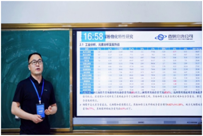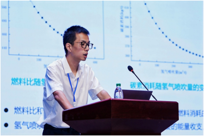 ▲梅鋼張光強作題為“生物質炭噴吹對煤粉燃燒和鐵礦石還原行為的影響研究”的報告