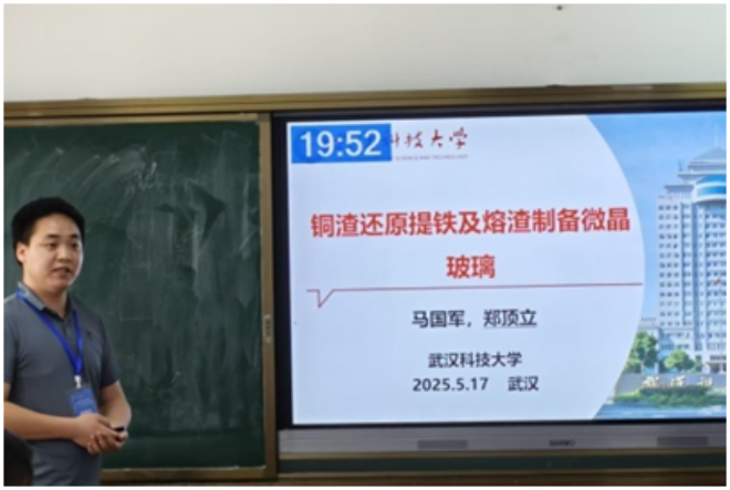 ▲武漢科技大學鄭頂立作題為“銅渣還原提鐵及尾渣製備微晶玻璃”的報告