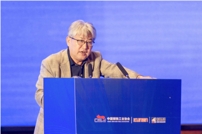 圖為北京科技大學教授潘崇超作《基於國產化的鋼鐵企業能碳一體化係統建設》主題報告