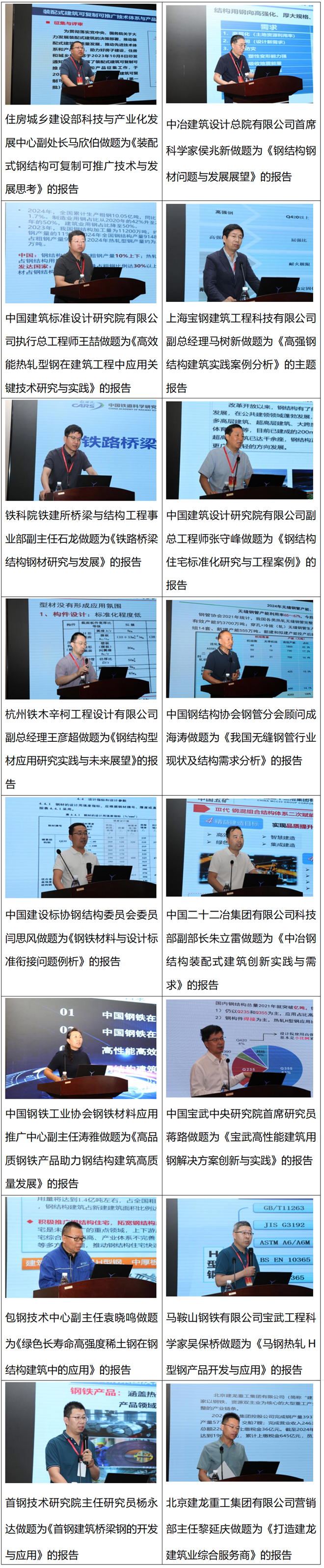 隨後,16位業內專家圍繞裝配式鋼結構可複製可推廣技術、高強鋼結構建築實踐案例、鋼結構住宅標準化研究、鋼鐵材料與設計標準銜接問題、鐵路橋梁結構鋼材研究與發展等產業鏈熱點話題做主旨報告。