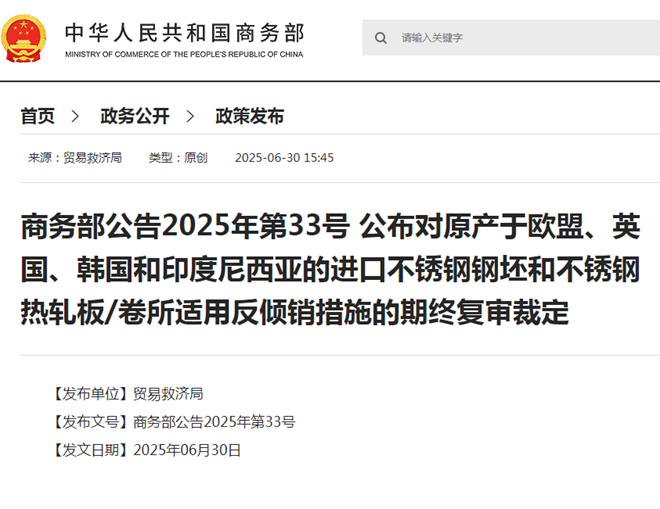 6月30日,商務部發布公告,公布了對原產於歐盟、英國、韓國和印度尼西亞的進口不鏽鋼鋼坯和不鏽鋼熱軋板/卷所適用反傾銷措施的期終複審裁定。