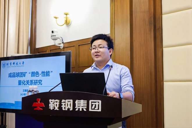 圖為北京科技大學副教授王耀祖作《成品球團礦“顏色-性能”量化關係研究》主題報告