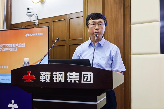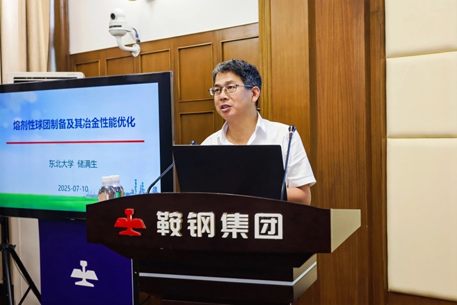 圖為鞍山鋼鐵技術中心煉鐵所首席專家周明順作《鞍鋼堿性球團實驗室基礎研究及其工業應用》主題報告