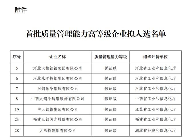 這些鋼企擬入選首批質量管理能力高等級企業