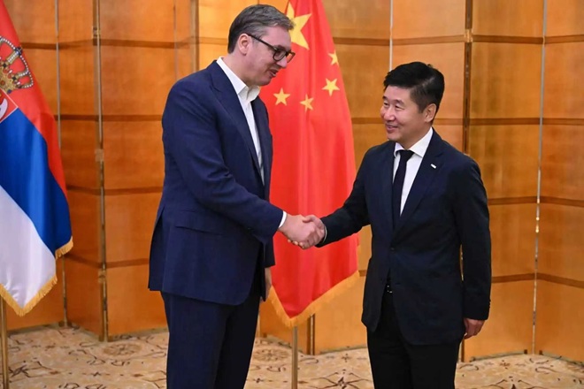 中國駐塞爾維亞大使李明,塞爾維亞前總統、中塞俄政府合作委員會主席托米斯拉夫·尼科利奇參加會見。
