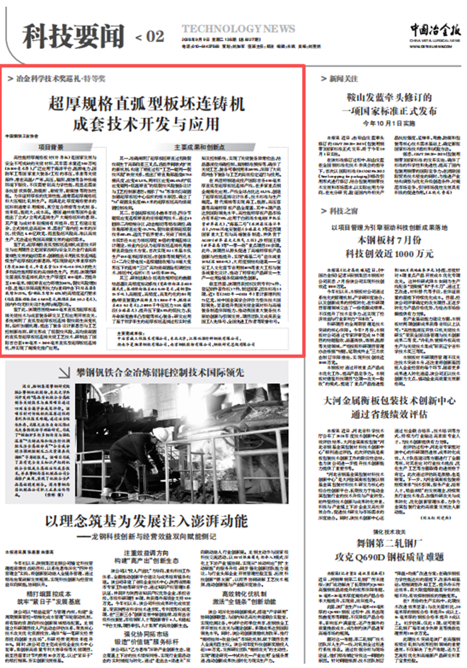 近期,2025年中國鋼鐵工業協會、中國金屬學會冶金科學技術獎公布,“超厚規格直弧型板坯連鑄機成套技術開發與應用”項目獲特等獎。