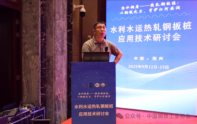 作為會議承辦方、工作組主任單位,河北津西鋼鐵集團股份有限公司總經理趙利欣介紹“破局之路”,技術應用研究所首席工程師(熱軋鋼板樁應用技術推廣工作組專家委員會主任)錢奕峰作《熱軋鋼板樁在水工領域的產品應用與發展》報告,詳解熱軋鋼板樁在水利領域應用的優點。他表示津西熱軋鋼板樁全球銷量占比超25%,獲中鋼協“金杯特優產品”稱號。在深中通道、黃茅海跨海通道中被稱為“定海神樁”;阜陽船閘項目中優化截麵設計節省造價500餘萬元;自主研發的生產監控係統實現全流程溯源,施工模擬平台可精準預判地質受力。錢奕峰表示“我們不僅提供材料,更提供‘設計+施工+售後’一站式解決方案。”