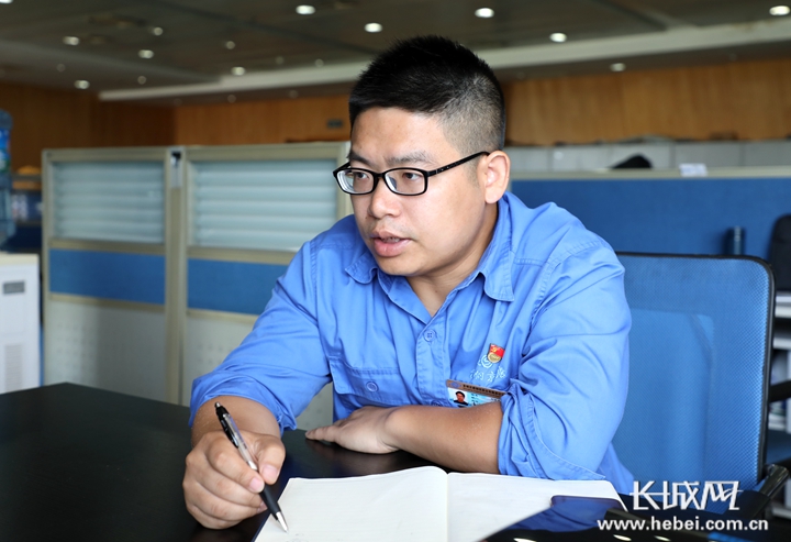 首鋼京唐製造部家電板室主任劉武華接受采訪。 記者 煙成群 攝