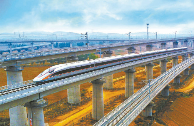 11月5日,魯南高鐵日照至曲阜段開始試運行(如圖)。魯南高鐵是國家“八縱八橫”鐵路網的重要組成部分,東起山東省日照市,向西經臨沂市、濟寧市、菏澤市,與河南省鄭徐高鐵蘭考南站接軌,全長約為494公裏。該項目自2017年1月25日開工建設以來,累計使用山鋼產品4萬餘噸,用於沿線高鐵站以及路橋建設。 (特約通訊員 李建輝 攝)