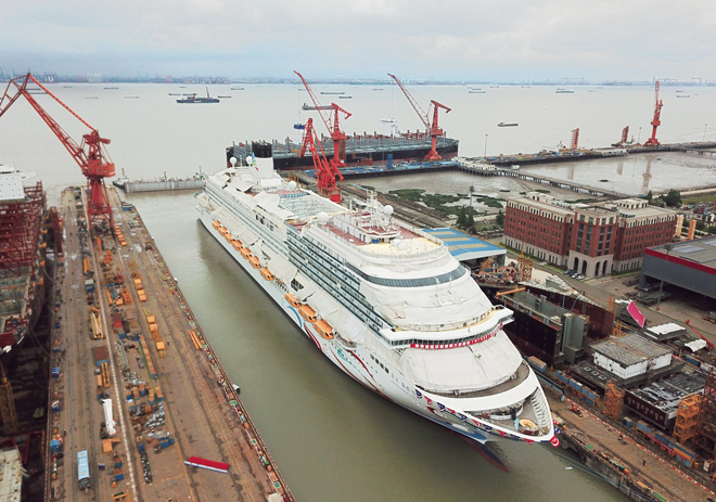 圖為首艘國產大型郵輪“愛達·魔都號”於6月6日在中國船舶集團上海外高橋造船有限公司正式出塢現場。 (通訊員 丁汀 攝)