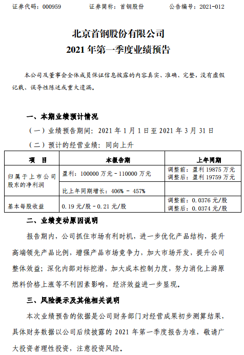 首鋼股份:北京首鋼股份有限公司2021年第一季度業績預告