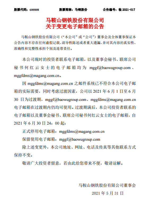 馬鞍山鋼鐵股份有限公司關於變更電子郵箱的公告