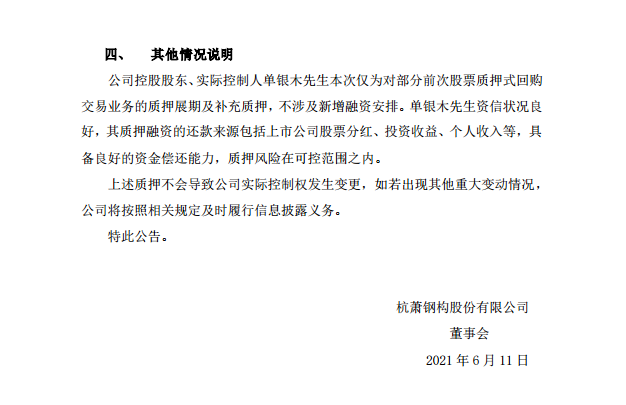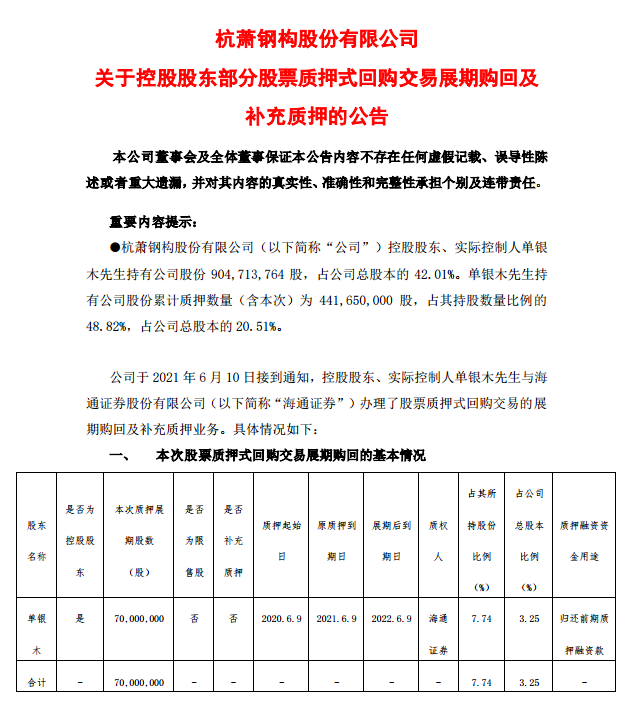 杭蕭鋼構關於控股股東部分股票質押式回購交易展期購回及補充質押的公告