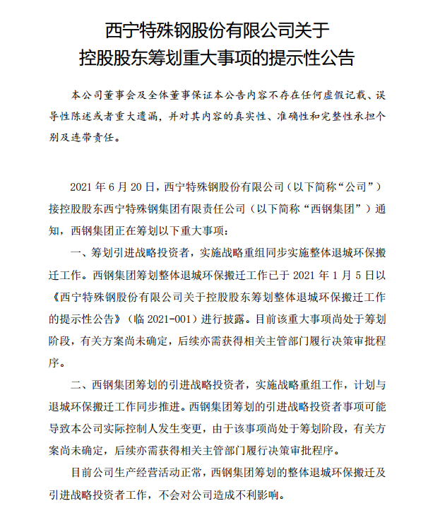 西寧特殊鋼股份有限公司關於控股股東籌劃重大事項的提示性公告