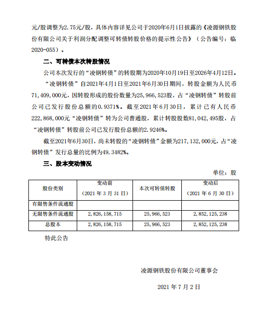 淩源鋼鐵股份有限公司可轉債轉股結果暨股份變動公告