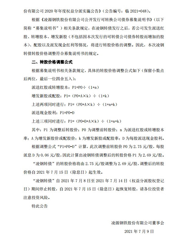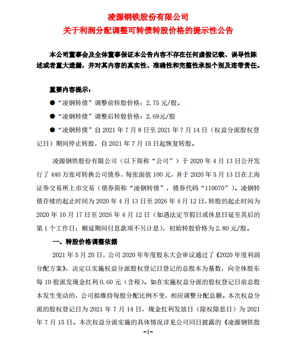 淩源鋼鐵股份有限公司關於利潤分配調整可轉債轉股價格的提示性公告