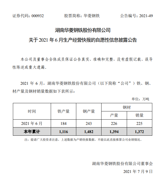華菱鋼鐵:關於2021年6月生產經營快報的自願性信息披露公告