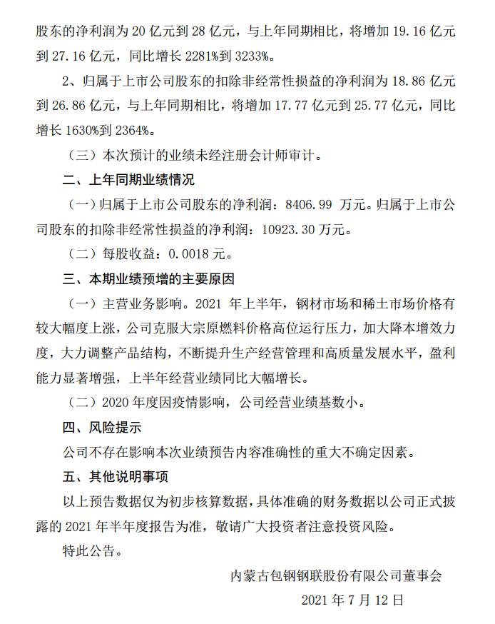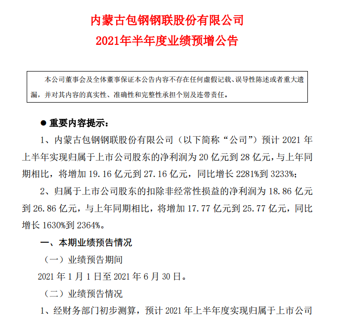 包鋼股份2021年半年度業績預增公告