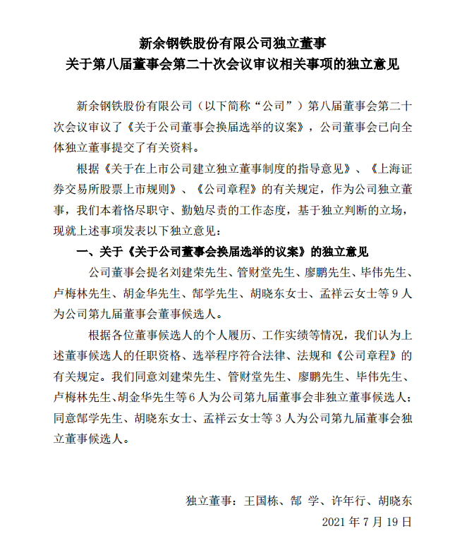 新鋼股份關於第八屆董事會第二十次會議審議相關事項的獨立意見