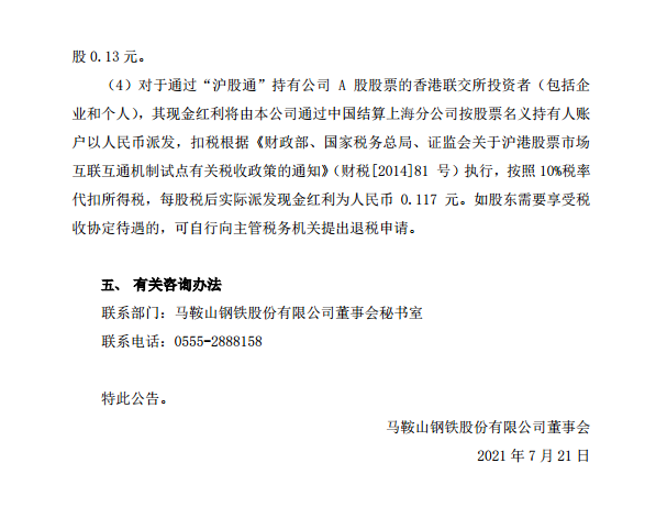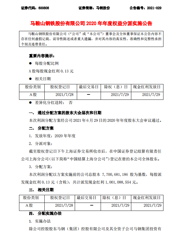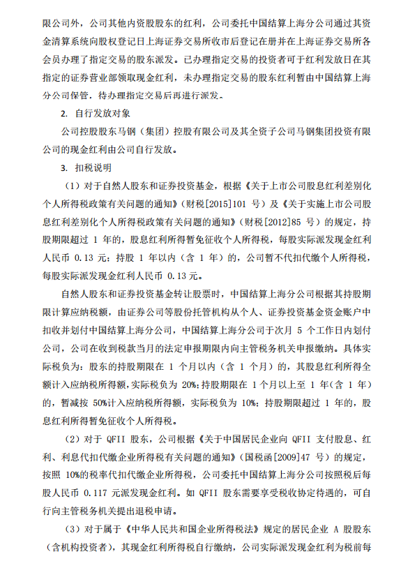 馬鞍山鋼鐵股份有限公司2020年年度權益分派實施公告