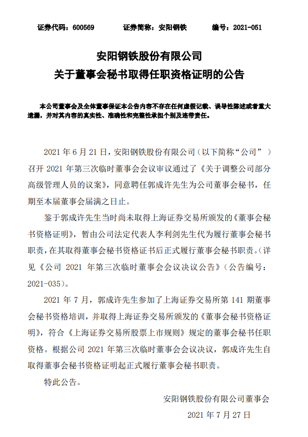 安陽鋼鐵股份有限公司關於董事會秘書取得任職資格證明的公告