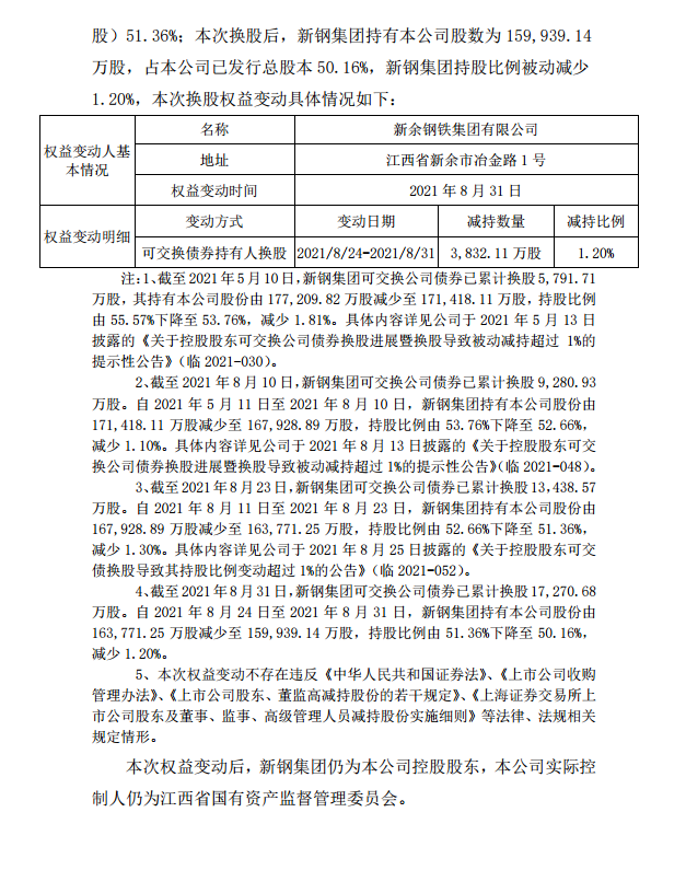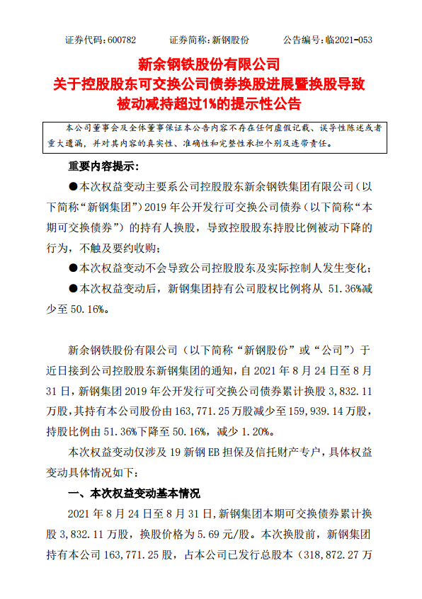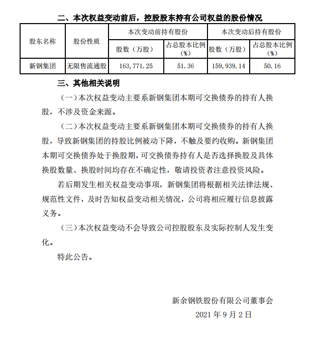 新鋼股份關於控股股東可交債換股導致其持股比例變動超過1%的公告