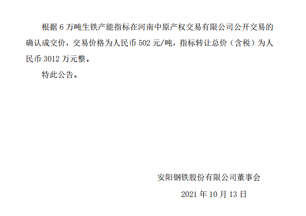安陽鋼鐵股份有限公司關於轉讓產能指標的公告