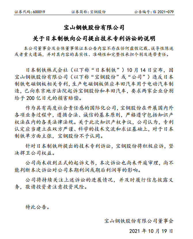 寶鋼股份關於日本製鐵向公司提出技術專利訴訟的說明