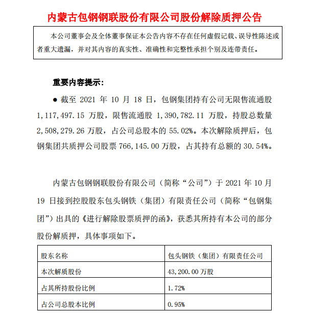包鋼股份股份解除質押公告