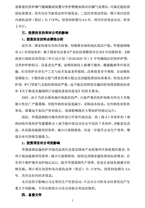 華菱鋼鐵:關於子公司華菱漣鋼焦爐環保升級改造項目的投資公告