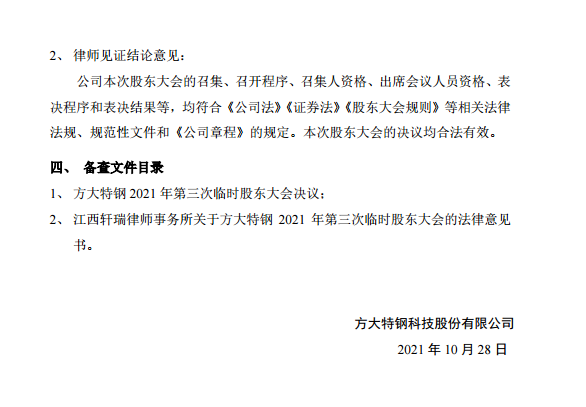 方大特鋼2021年第三次臨時股東大會決議公告
