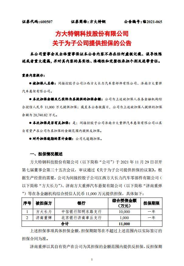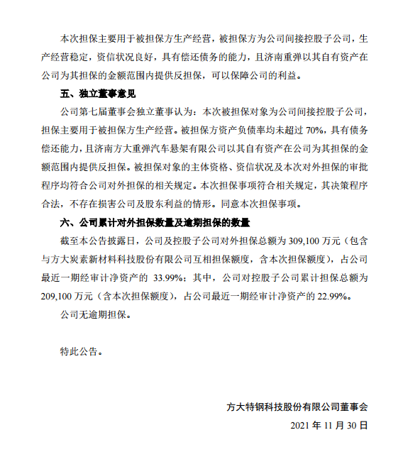 方大特鋼關於為子公司提供擔保的公告