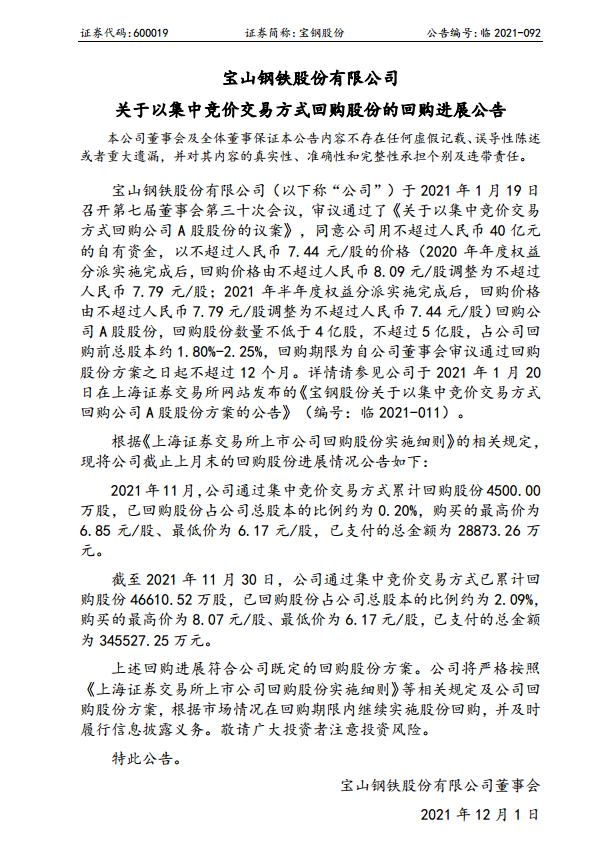 寶鋼股份關於以集中競價交易方式回購股份的回購進展公告
