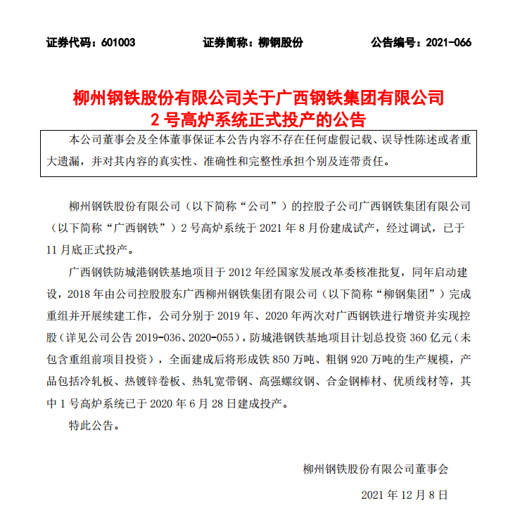 柳鋼股份關於廣西鋼鐵集團有限公司2號高爐係統正式投產的公告