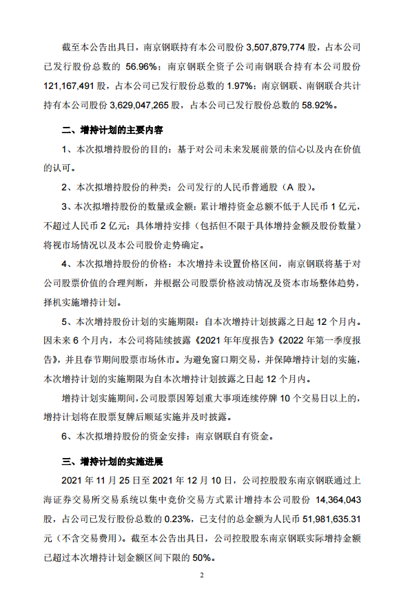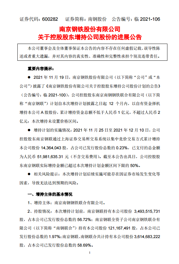 南京鋼鐵股份有限公司關於控股股東增持公司股份的進展公告